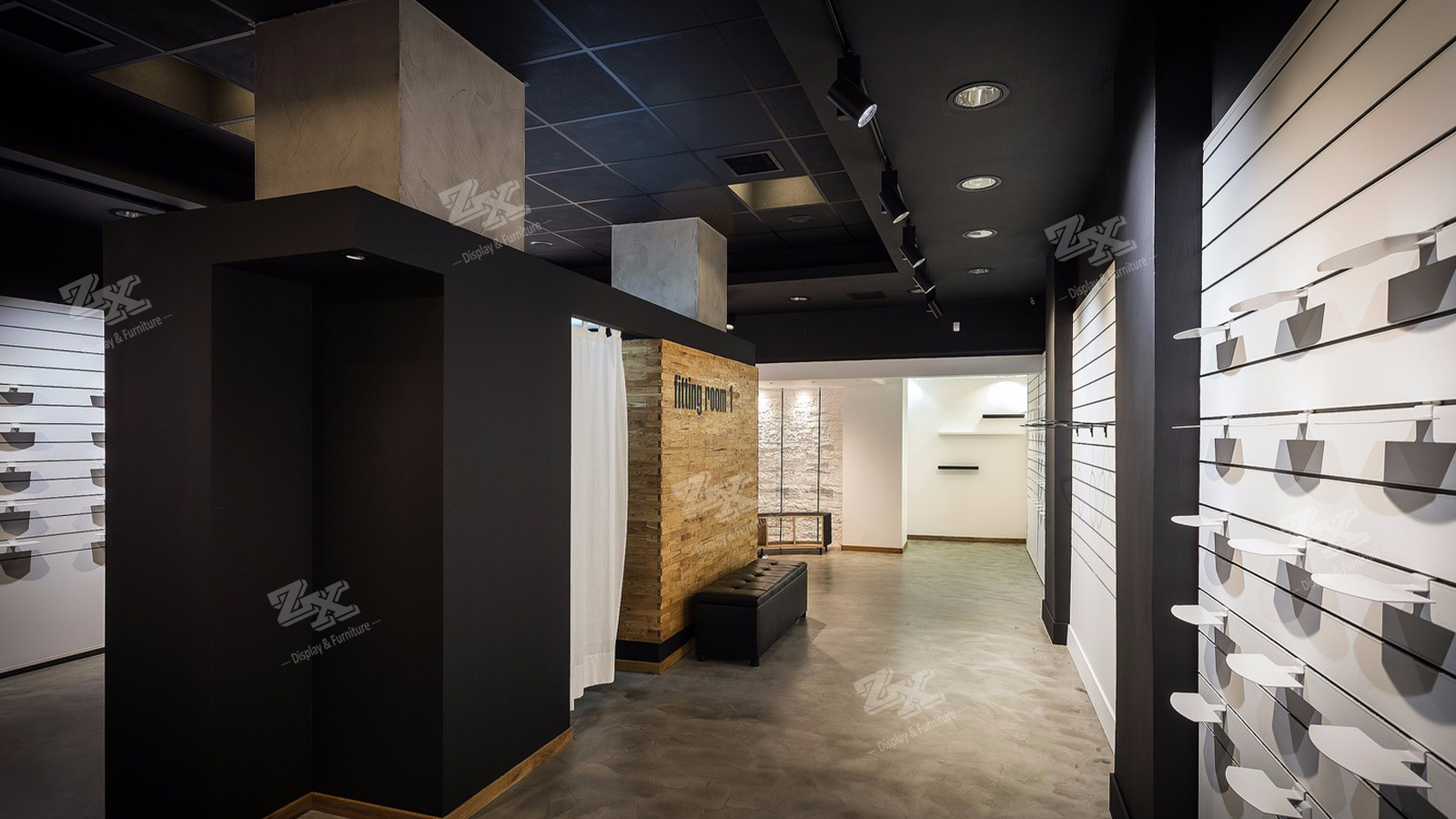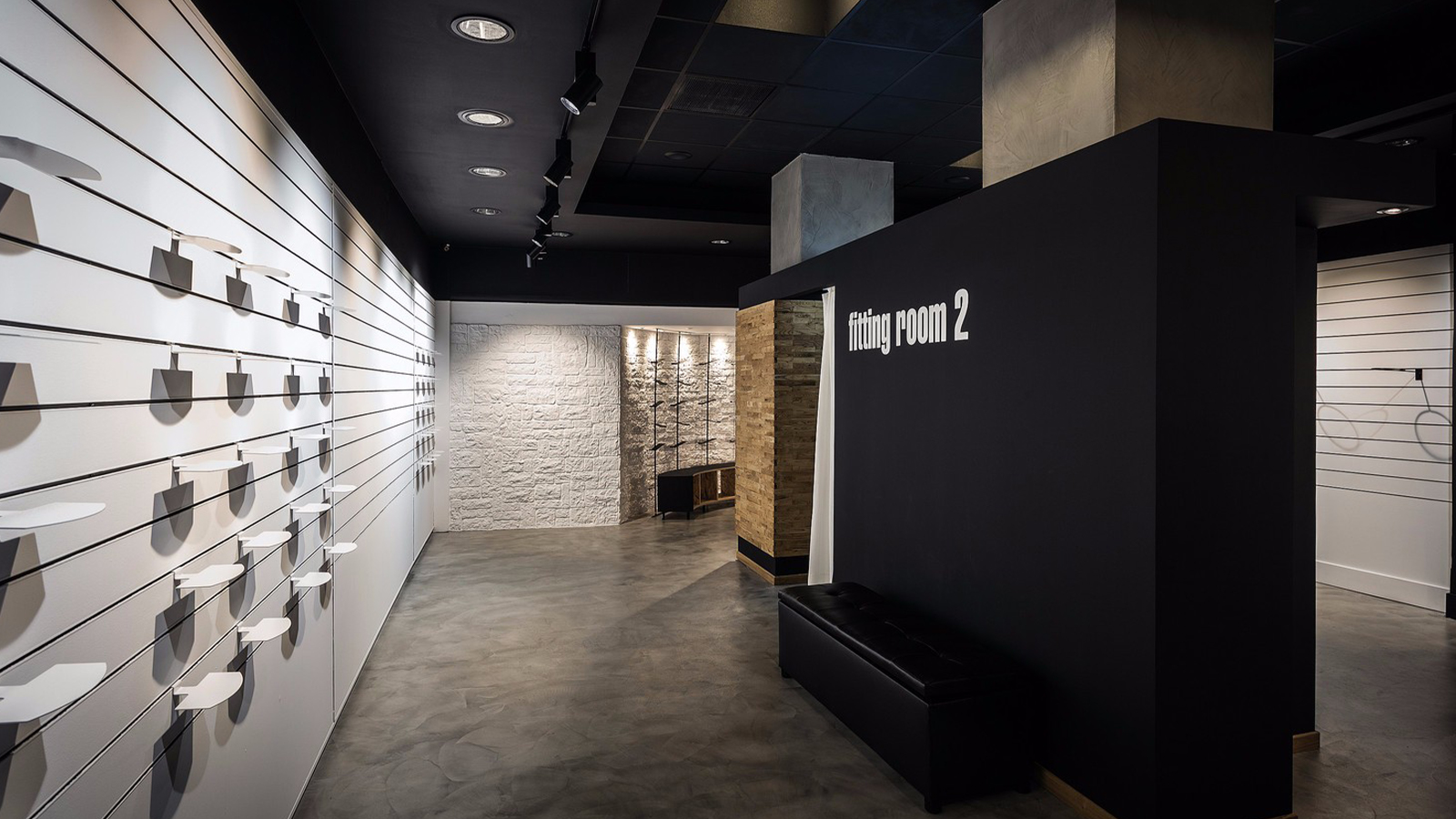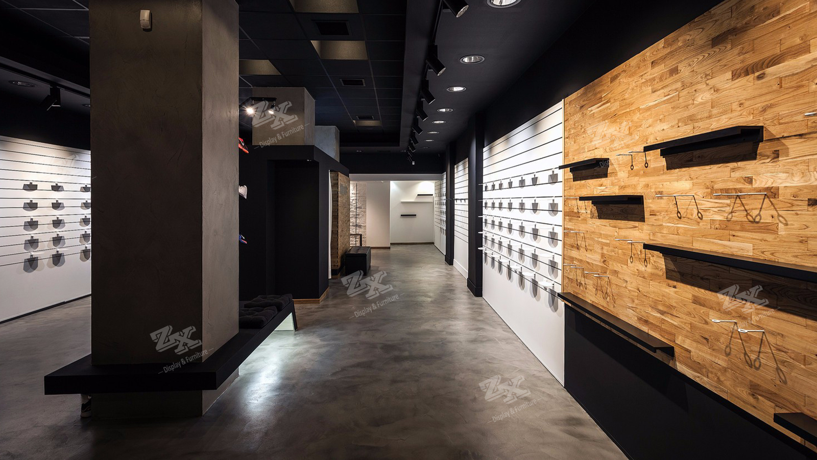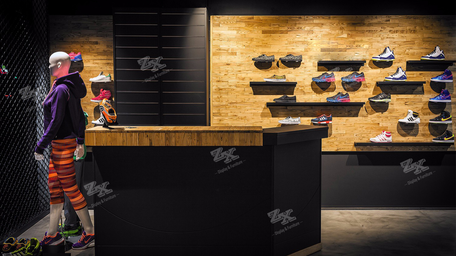 Tags: shoe slat wall display, sportswear shop fittings, sportswear shop interior design, sports shoe shop design